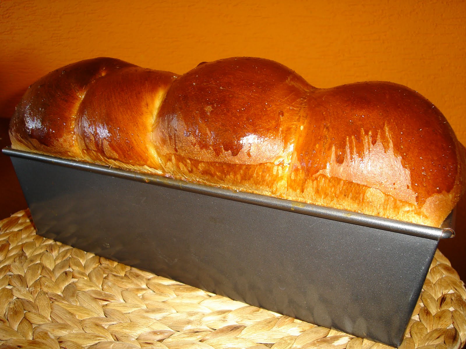 Verter os ingredientes pela ordem indicada na cuba da maquina e programar amassar. Quando acabar retirar a massa dividir em 2 partes  iguais e formar uma "trança" colocar dentro de uma forma de bolo ingles deixar repousar no minimo 40minutos  (o meu pao ficou a levedar dentro da forma durante 4h, tive de sair e quando cheguei coloquei no forno como podem ver nao lhe aconteceu nada,e ate acho que vou começar a deixar levedar sempre assim pois nao ficou com aquele gosto a fermento que normalmente ficam).